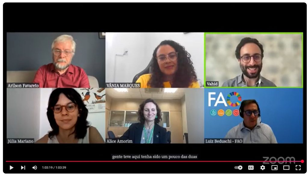 O evento contou com a participação de Vania Marques, secretária de Política Agrícola da Confederação Nacional dos Trabalhadores na Agricultura (Contag); Alice Vogas, chefe da Assessoria Especial para a COP 30 do Ministério do Meio Ambiente (MMA); Luiz Carlos Beduschi, oficial de Políticas da FAO; e Arilson Favareto, integrante da coordenação do Cebrap Sustentabilidade e da Cátedra Josué de Castro.