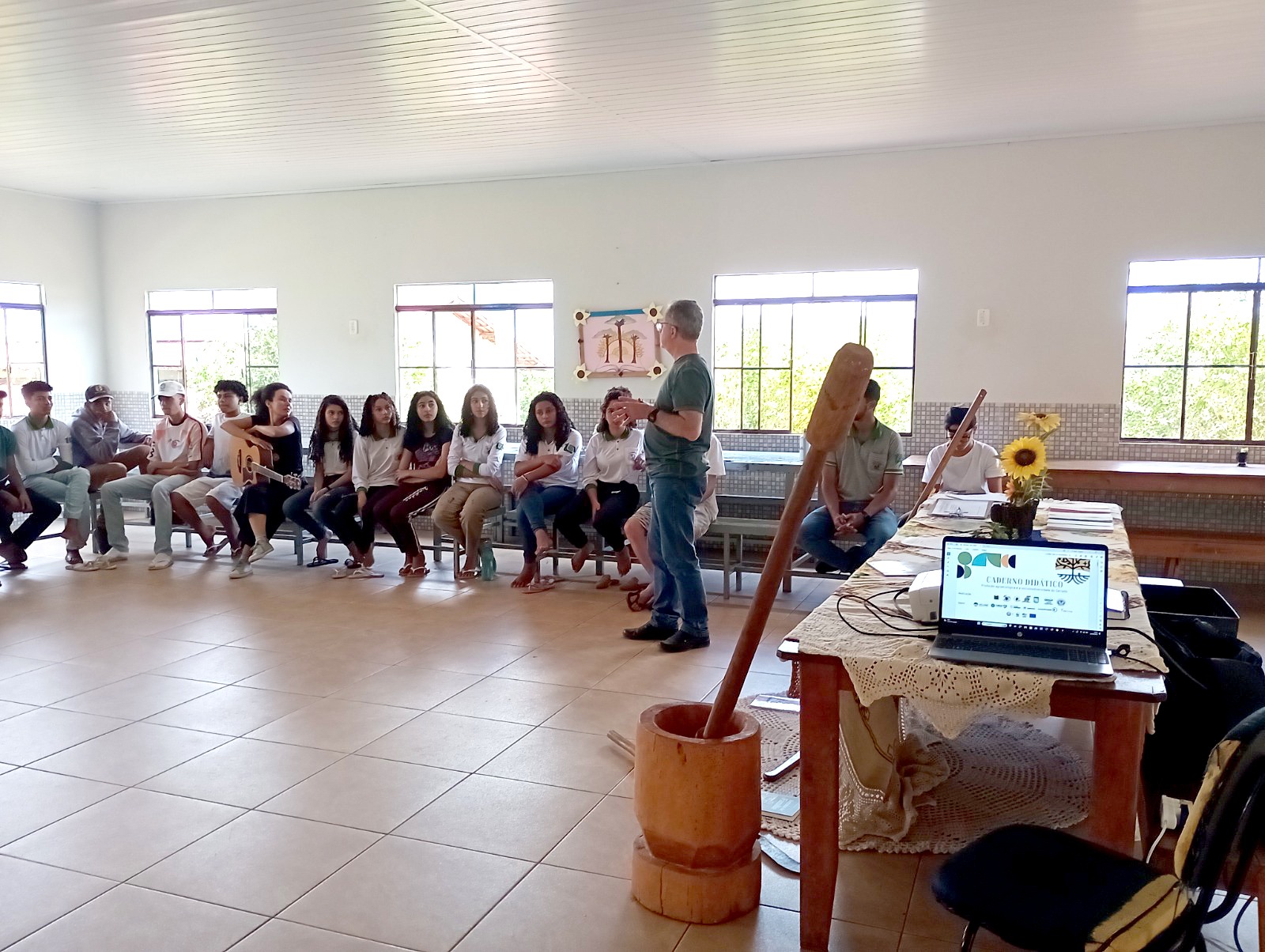 Professor João Begnami, coordenador pedagógico da AMEFA e organizador do Caderno Didático explicando a metodologia do encontro em Veredinha-MG