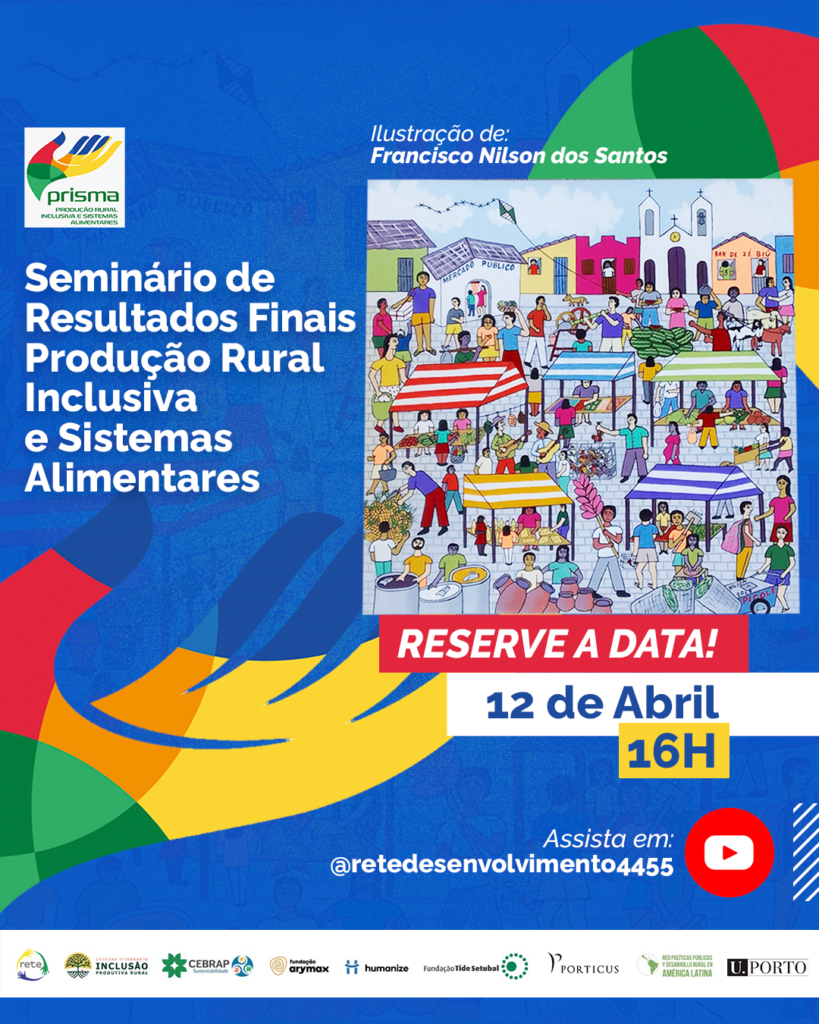 A Rede Brasileira de Pesquisa e Gestão em Desenvolvimento Territorial (Rete), organização-sede da Cátedra Itinerante, realizará o Seminário: Resultados finais do Projeto Produção Rural Inclusiva e Sistemas Alimentares, no dia 12 de abril, a partir das 16h. O evento será transmitido ao vivo pelo @retedesenvolvimento4455 .